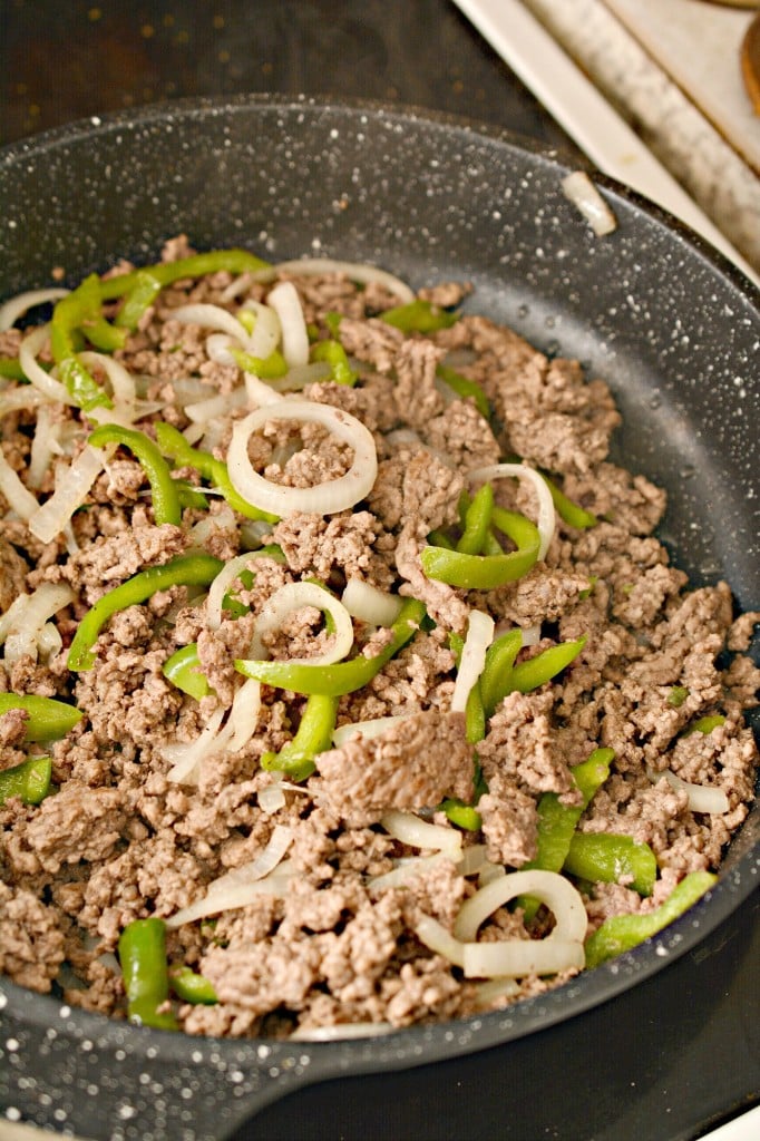 Saute the ground beef, onion, and pepper in a skillet over medium-high heat on the stove until the vegetables have softened and the meat is completely browned. Drain any excess grease.