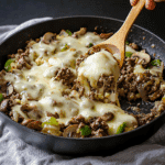 Now it’s time to add the provolone cheese. Arrange 10 slices of provolone on top of the beef and veggie mixture, making sure the cheese covers the surface evenly. Cover the skillet with a lid and let the cheese melt for about 5 minutes. The cheese will become perfectly gooey and create that classic cheesesteak experience without the bread.